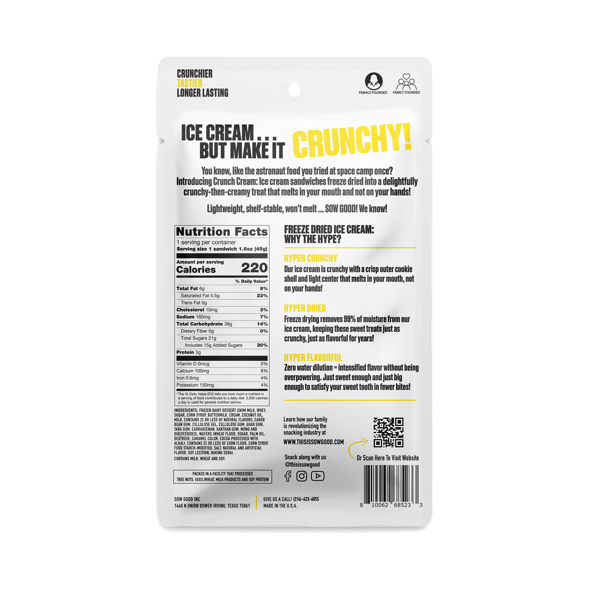 Experience vanilla like never before with Vanilla Crunch! We’ve taken the classic vanilla ice cream sandwich and given it a freeze-dried twist, turning it into a satisfyingly crispy snack. Each bite delivers the rich, creamy vanilla flavor you love, now with an irresistible crunch. Plus, it's more concentrated, bigger in size, and lasts longer, so you can indulge in your favorite dessert in an excitingly crunchy way!